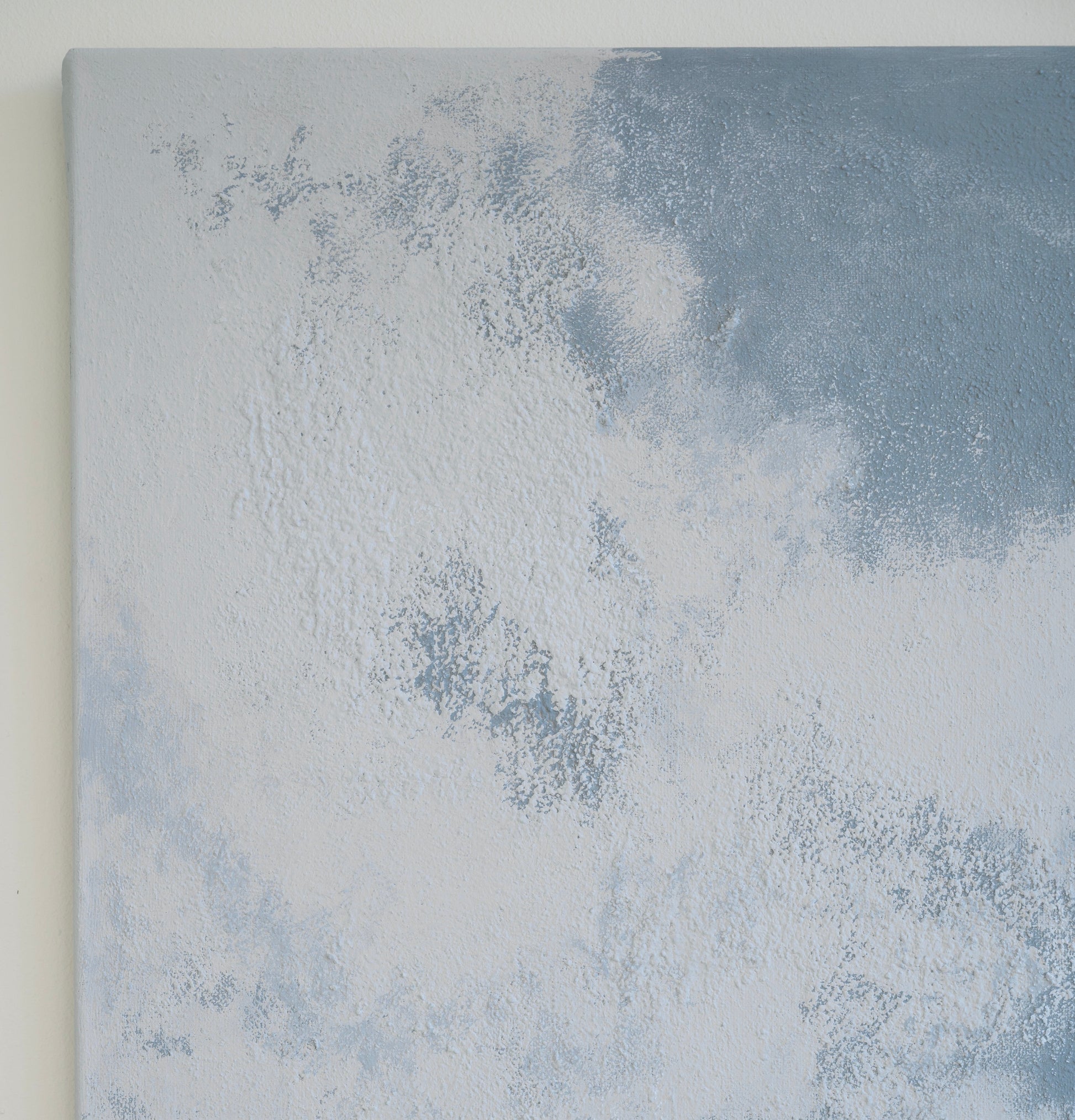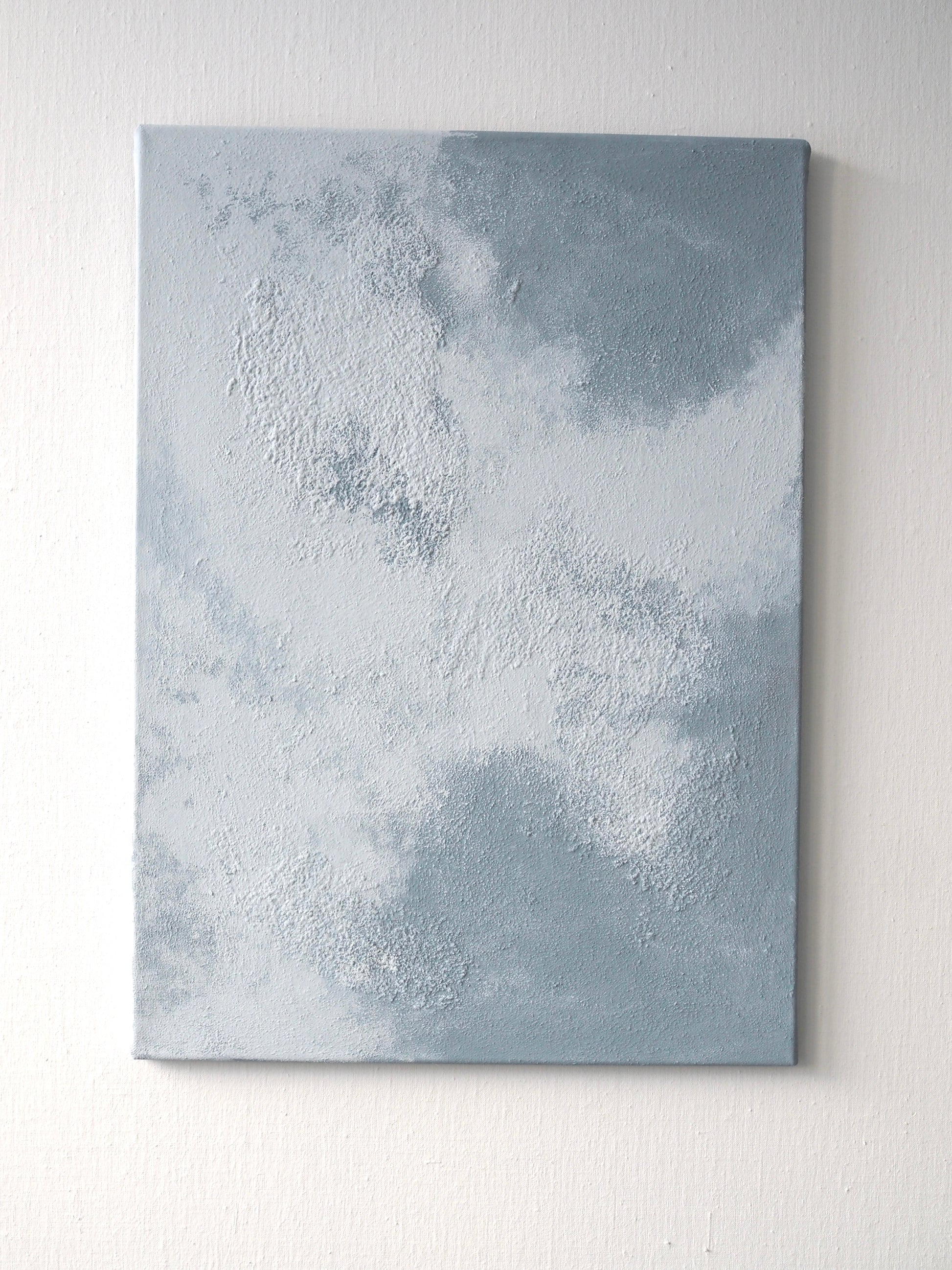 Layered blue tones and a raw, textured surface evoke the calm of a clouded sky.