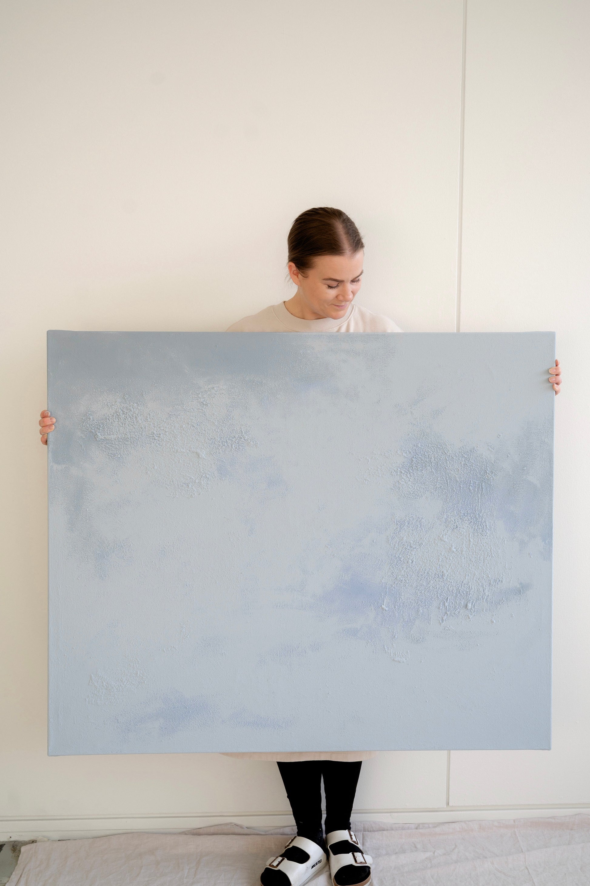 This larger piece holds the most balanced expression of the Still series, defined by calm blue tones and a quiet, grounded presence. Its scale allows the colors and textures to unfold slowly, creating a sense of openness and ease within a space.